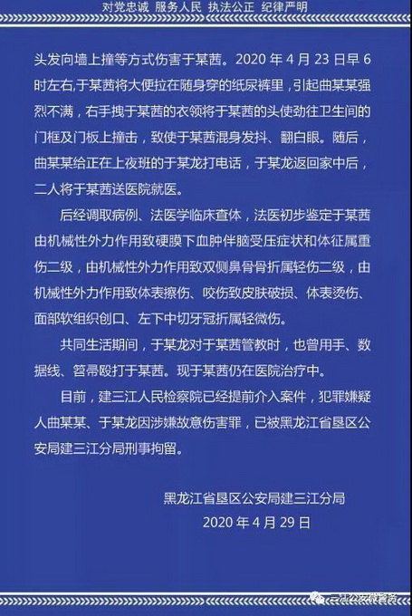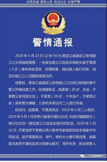 據(jù)三江公安微警務微信公號,黑龍江省墾區(qū)公安局建三江分局發(fā)布了有關(guān)女童被虐打案的最新通報,稱曲某某為發(fā)泄不滿先后多次用拳頭毆打、用開水燙、抓住被害人頭發(fā)向墻上撞等方式傷害于某茜。法醫(yī)初步鑒定,于某茜身體不同部位傷勢分別屬重傷二級、輕傷二級和輕微傷。
