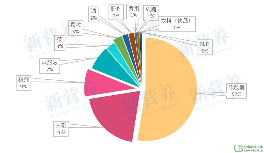 從產品劑型上看,軟膠囊劑居多,數量達147個,占總數的52%;其次是片劑(20%)、粉劑(9%)和口服液(7%)。此外,在3月批準的產品中還有如茶類、酒類、糖果、飲料等其他食品形態的產品。