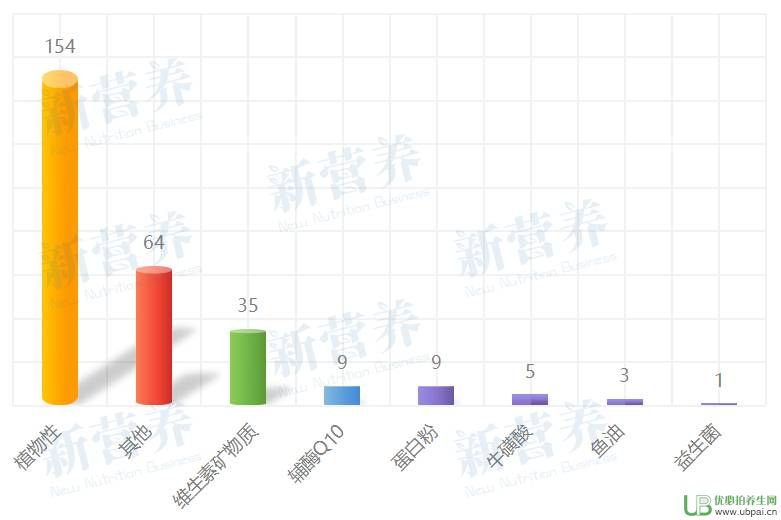 其中,在植物性營養素類別中,靈芝(含靈芝孢子,27%)、西洋參(15%)、黃芪(11%)、葛根(9%)等傳統中藥類原料居多;紅景天、人參、番茄紅素、丹參、螺旋藻等較為常見。