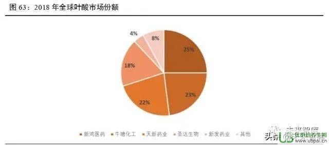 葉酸產能最初是由德國拜耳、瑞士羅氏和美國默克等大公司所壟斷,近年來國外大公司均已退出葉酸市場競爭,目前全球葉酸供應幾乎全部來自于中國,主要供應商包括常州牛塘化工、新發藥業、常州新鴻醫藥化工、河北冀衡藥業、常州康瑞化工及圣達生物,總產能近3500噸。根據博亞和訊統計,2018 年全球供應格局中,新鴻醫藥、牛塘化工、天新藥業、圣達生物、新發藥業葉酸(折純)產量分別為 450噸(25%)、420 噸(23%)、 400 噸(22%)、 320 噸(18%)、 70 噸(4%),合計 1660 噸,占全球產量的 92%。
