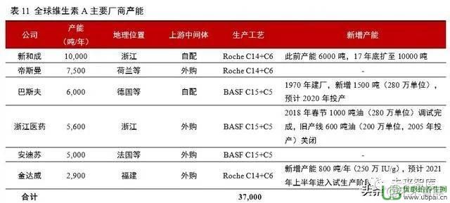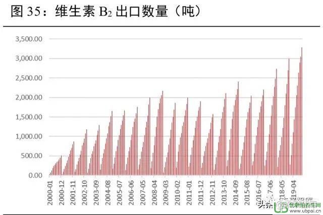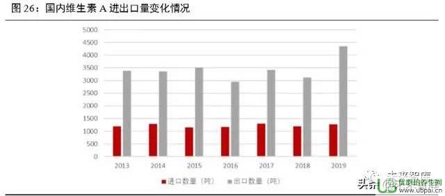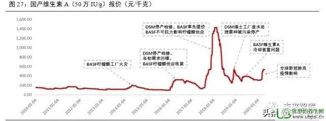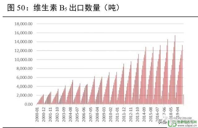 (3)2019 年 4 月,DSM 瑞士工廠因廢水處理的菌種被污染,停產 2~3 個月,使得供給端受影響,推動價格上漲;2019 年 6 月,巴斯夫德國工廠LutavitA1000 和 LutavitA/D3因生產最后一步有問題停產;2019年 8 月 29 日,BASF 宣布德國工廠維生素 A(100 萬 IU)預計在 11 月恢復生產,但四季度開工率將保持較低水平,2020 年一季度產量會有所恢復,但整體而言,產量會低于正常水平。同時,2020 年下半年將會有停產計劃(擴建維生素 A 生產線);