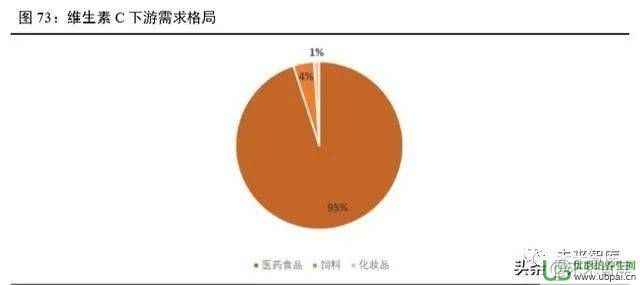 維生素 C下游主要用于醫藥食品、飼料、化妝品等行業,醫藥食品為最主要的應用領域,占比達到 95%,其中食品添加劑一個領域就占據了近 70%的份額。