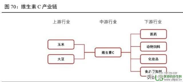 維生素 C 廣泛存在于蔬菜、水果中,因此其產業鏈上游行業以玉米、大豆等農作物種植業為主,其下游主要應用于醫藥、動物飼料、化妝品及食品添加劑行業,其中食品添加劑行業最為主要,占比近 70%。
