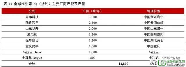 根據我們的統計,全球維生素 K3名義產能共約 12,800 噸/年,其中 85%以上的產能位于中國,2018 年全球維生素K3產量7,030 噸,全球開工率約 55%。兄弟科技為全球最大的維生素K3供應商,名義年產能達到 3,000 噸,2018 年維生素 K3產量約為 2,500 噸,開工率約 83%。