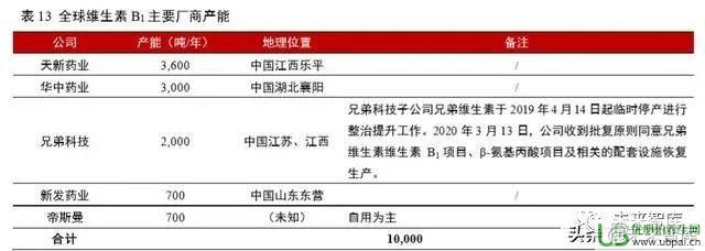目前,兄弟科技在維生素領域擁有維生素 K3產能 3,000 噸/年,維生素 B1產能 3,200 噸/年(有效產能約 2,000 噸/年),維生素 B3產能 13,000 噸/年,維生素 B5產能 5,000 噸/年。維生素 K3產線位于公司海寧本部;維生素 B1產線屬于子公司兄弟維生素,位于江蘇,2019 年 4 月起停產進行整治提升工作,2020 年 3月收到政府批復原則同意恢復生產;維生素 B3及維生素 B5產線位于公司江西基地。