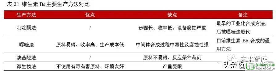 我們對各種類維生素及其中間體的行業壁壘進行了統計。13 中常見維生素中,維生素 A、維生素 B7(生物素)、維生素 D3及維生素 E 的中間體合成技術壁壘高,生產企業少,中間體的供應情況可能在較大程度上影響維生素的生產;維生素 A、維生素 B1及生物素本身的合成技術壁壘高,市場難有新進入者。此外,維生素 B1、維生素 B5(泛酸)及維生素 B9(葉酸)合成工藝的環保壁壘高,若無高昂的環保投入,難以進入該行業。