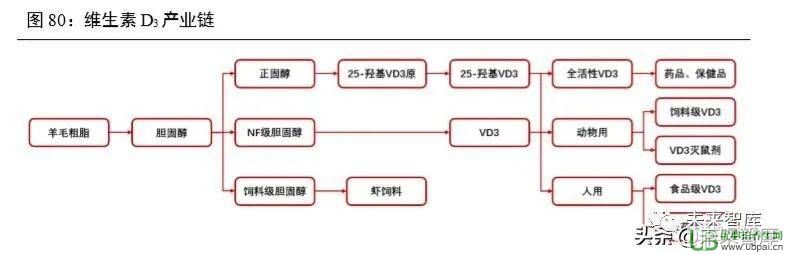 維生素 D3的產業鏈上游為羊毛脂及從羊毛脂中提取的膽固醇,NF 級膽固醇被用于制備維生素 D3,進而根據不同的用途合成不同結構和濃度的下游產品,最終用于飼料、醫藥及食品添加劑行業。