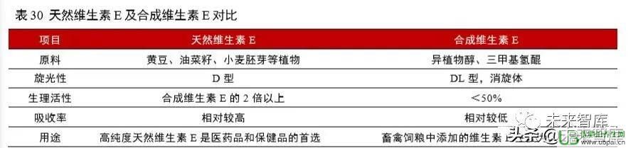 維生素 E 分為天然維生素 E 和合成維生素 E。天然維生素 E 主要來源于黃豆、油菜籽、小麥胚芽等植物原料,食用安全性高,且由于其是具有生理活性的右旋體,因此生物活性高,天然維生素 E 根據其純度的不同,已廣泛運用于保健品、醫藥品、食品、飼料添加劑以及化妝品等生產領域,高純度的天然維生素 E 更是醫藥品和保健品的首選。合成維生素 E 的重要原料為異植物醇及三甲基氫醌,由于其是 DL 消旋體,生理活性明顯低于天然維生素 E,但由于合成維生素 E 可大批量進行生產,產品結構易于調控,價格低,是目前維生素 E 行業的主流,占比 80%左右。