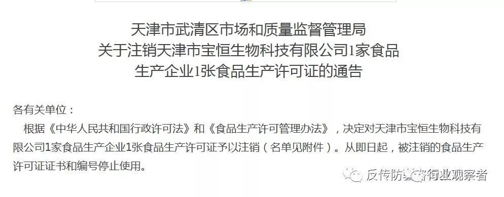 與此同時(shí),據(jù)天津市武清區(qū)市場和質(zhì)量監(jiān)督管理局網(wǎng)站顯示,天津市寶恒生物科技有限公司食品生產(chǎn)許可證已注銷,提醒網(wǎng)友注意食品安全。