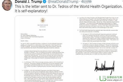 美國總統特朗普在推特上發布了一封寫給世界衛生組織總干事譚德塞的信,威脅稱要永久切斷美國對世衛組織的資助。